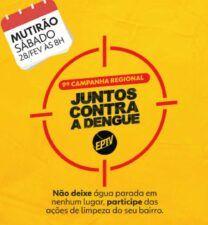 A cidade de São Lourenço realiza neste sábado, das 8h às 13h, uma grande mobilização contra a dengue no bairro Nossa Senhora de Lourdes, dentro da campanha promovida pela EPTV.O multirão de limpeza e recolhimento de bens inservíveis, será realizado com o objetivo de eliminar possíveis criadouros do